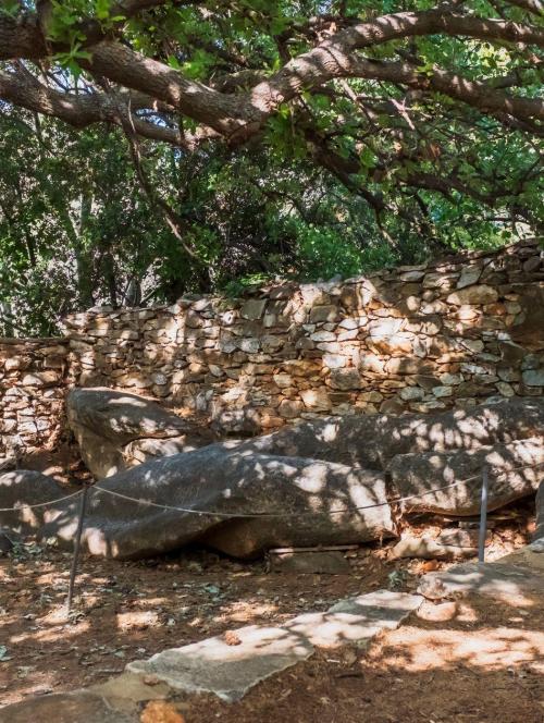 Continuing in a gentle loop, the path runs beneath the remains of the ancient aqueduct and reaches Flerio, where visitors can explore the Sanctuary of the Springs and see the unfinished archaic kouroi at the nearby marble quarries (7th–6th century BC). From here, the route climbs gradually along a wide path toward the Potamia valley, passing well-preserved threshing floors and old lime kilns.